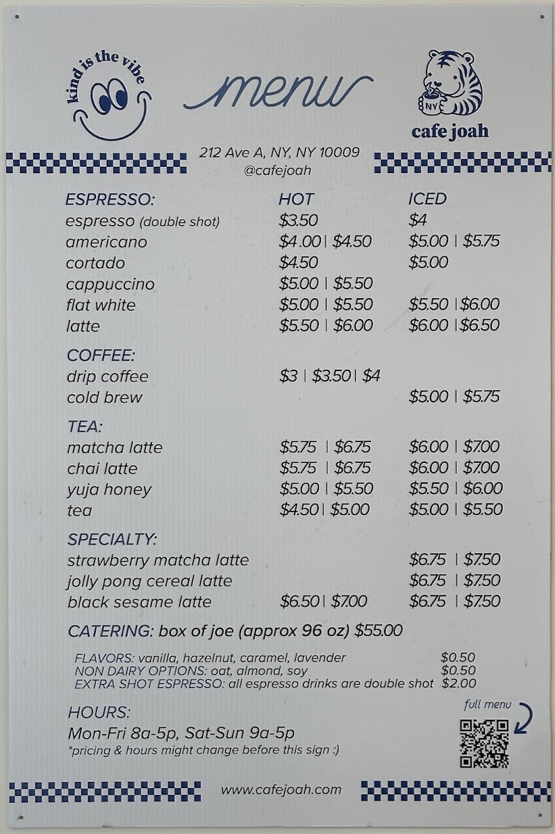 Welcome to Cafe Joah, a quaint gem nestled at 212 Avenue A in New York's vibrant East Village. This charming café delights coffee enthusiasts and casual drinkers alike with its fantastic menu. The offerings include an array of espresso-based beverages, such as the rich Cappuccino ($5.00) and the smooth Latte ($5.50), alongside options like Coffee and Hot Tea, perfect for any palate.
